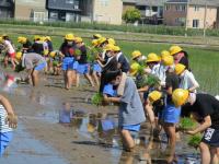 田んぼに足を入れたことのない子ども達がほとんどのためか、最初は、恐る恐る田んぼの中に足を入れていく姿が見られました。どろの感触に戸惑いを感じたのかあちらこちらで悲鳴に似たような声が聞こえてきます。次第に、田植えになれてきた子ども達は、黙々と作業をしていました。実際に体験をしてみることで、機械を使わずに田植えをすることの大変さを感じることが出来たのではないでしょうか。秋の稲刈り体験も今から楽しみです。