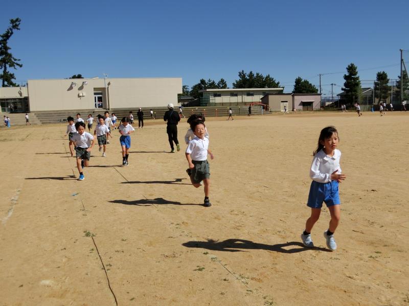 11月6日に予定しているマラソン大会に向けて、長休みの時間に運動場でかけ足運動を行っています。体力の向上と粘り強く取り組む態度の育成をめざして全校参加で、奇数学年・偶数学年別に実施しています。歩かず自分のペースで一生懸命走る姿が見られます。先生達も一緒にがんばっています。