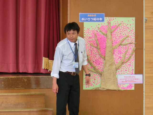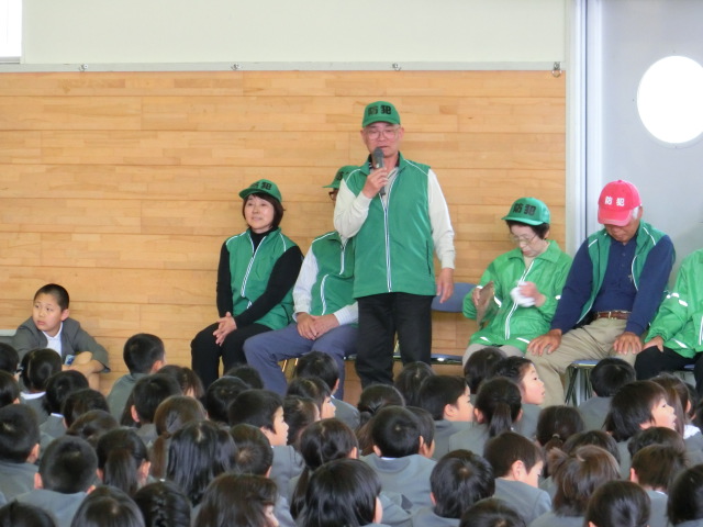 全校集会ではいつも登下校でお世話になっている安全ボランティアさんとの