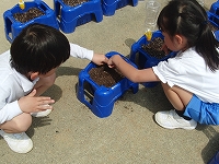 種を植えた後は、はじめての水やりもしました。みんな自分の植木鉢に大事そうに水やりをしていました。きれいなアサガオがさくのが楽しみです。