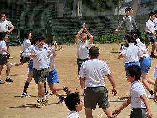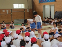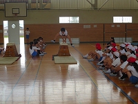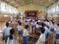去年自分たちが学習したことを4年生に教えるために、器械運動の発表をしました。技だけでなく、協力して素早く準備することや静かに待つこと、大きな声で呼名したり返事したりすることも大切だということが伝わるよう、きびきびとした態度で臨んでいました。