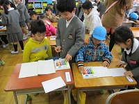つぎに、新1年生と手をつないで学校の中の教室を案内してあげました。そして、教室の中では自分の机に座らせ、クーピーを渡して絵を描かせてあげたり教科書の中を見せてあげたりしました。