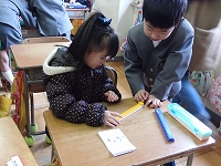 つぎに、新1年生と手をつないで学校の中の教室を案内してあげました。そして、教室の中では自分の机に座らせ、クーピーを渡して絵を描かせてあげたり教科書の中を見せてあげたりしました。
