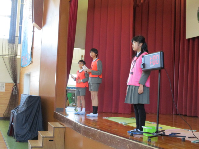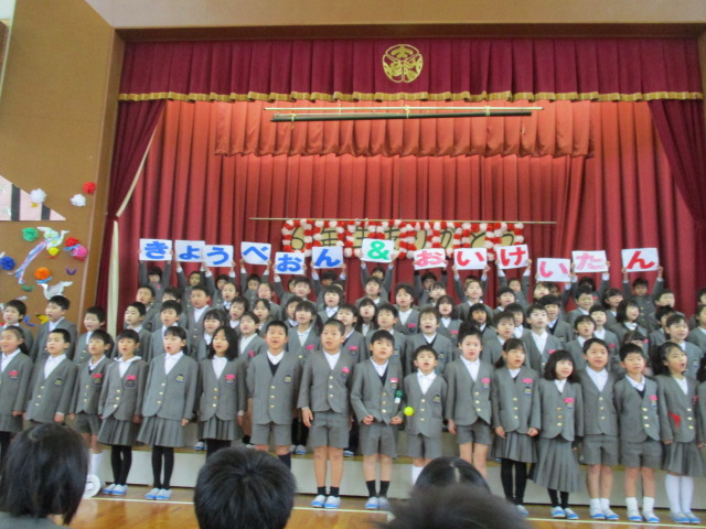 まずは、1年生全員で学校紹介の発表をしました。