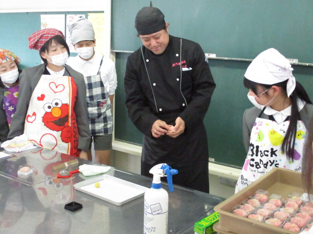 に学校にお越しいただき、卒業記念品の和菓子を作りました。初めての体験に子ど