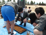 そのもみを持って、いよいよ苗代作りです。青空の下、みんなで少しずつもみをまきました。
