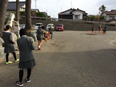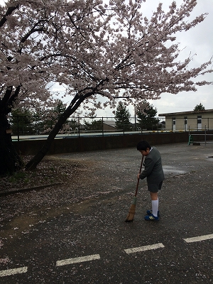 4年生の中には、桜の花びらをほうきではく子も…。