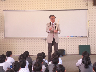黒川先生が色々な種類のリコーダーを演奏してくださると、3年生は初めてのリコーダーの音色に耳を澄ませ、興味深く聴き入っていました。講習会後には「これからたくさん練習して上手になりたいな。」という児童のつぶやきも聞こえてきました。