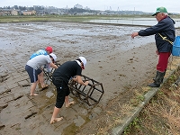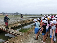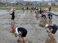 あいにくの曇り空でしたが、子どもたちは田んぼの感触を味わいながら、田植え体験を楽し
