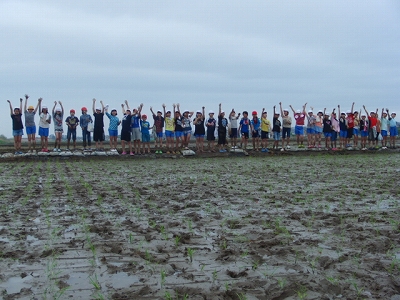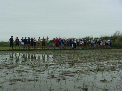 今日はゲストティーチャーの高道さんの田んぼを借りて、全員で田植え体験をしてきました。