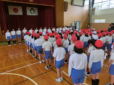 朝の集いで共に宿泊する津幡町立太白台小学校の皆さんと学校紹介を行いました。