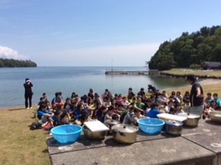 途中、海沿いでアメフラシやウニを見つけ大はしゃぎの子どもたちでした。