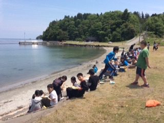 クイズに答えながら、海岸沿いをグループで歩きました。