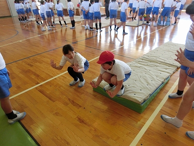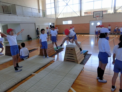 マット、跳び箱、鉄棒で技を教わった4年生は、