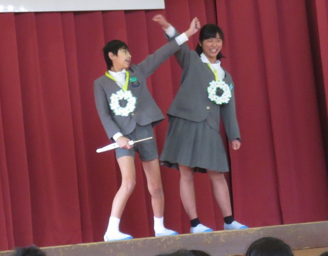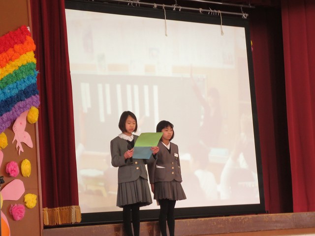 1年生はかわいい劇で6年生に笑顔を届けてくれました。幕間の出し物では、6年生がお世話になったかつての担任の先生からのお手紙を披露しました。