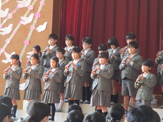 3年生で使い始めたリコーダーで、校歌を吹き、「四季の眺め」や「規律」、「勤勉の二字」に6年生のすてきなところを当てはめていきました。リコーダーの輪唱がとてもすてきでした。