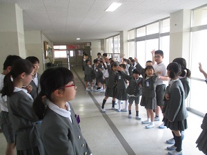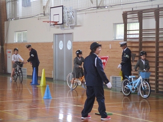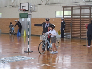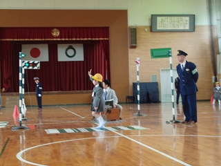 お話が終わってからは、いよいよ実地指導。雨が降っていたので、体育館で行いました。子どもたちは、警察官の指示に従いながら正しく横断歩道を渡ったり、道を歩いたりしていました。これからは今日のことを思い出しながら、安全に通学できそうですね。