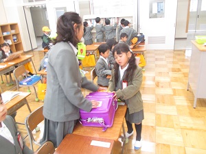 「ランドセル、一緒にロッカーに入れようね。」