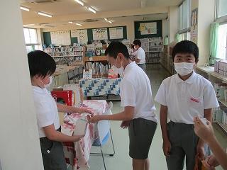 図書委員会は本の貸し出しの仕事をがんばっています。入り口で手の消毒も呼びかけています。