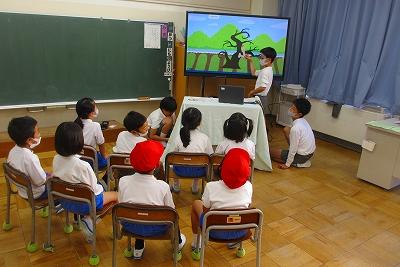 英語で紹介することに挑戦してきました。話している英語の台詞とペープサートの動きを合わせることで表現が身につくように何度も練習しました。