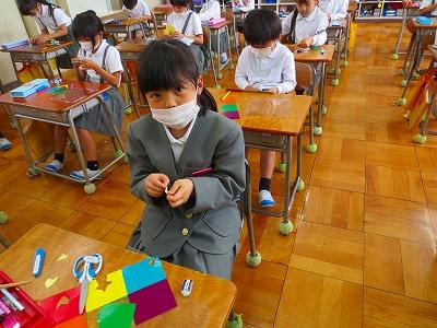 図工の「ひかりのプレゼント」の学習で、光を通すざいりょうを使って、うちわを作っています。