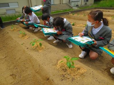 今年は、学校の畑に、なす、ピーマン、オクラ、きゅうり、枝豆の5つの野菜を植えました。野菜の育ち方にはどのような違いがあるのか、子どもたちも興味津々。今日は、みんなで苗の様子を観察しました。