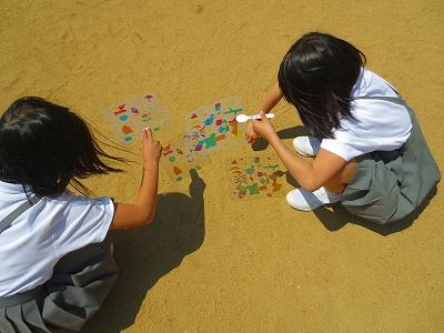先週の図工の時間に、光を通して形や色をうつすうちわを作りました。今日は、運動場でうちわに太陽の光を通して、楽しい見え方を探しました。