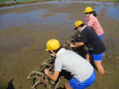 転がしでつけた印の所に苗を植えるのですが、思ったように苗が植えられなかったり、泥に足をとられたりと大変だったようです。