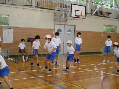 そのほかにも股関節を柔軟にする運動や肩の筋力をつける運動など、楽しみながらたくさんの運動をしていた子ども達。体育館は涼しい風が通り抜けることや、運動一つ一つは短くあっという間に次の運動へと進むため、体力もさほど消耗することなく、息もあがることもありませんでしたので、多くの子はマスクを着用したままの運動でした。