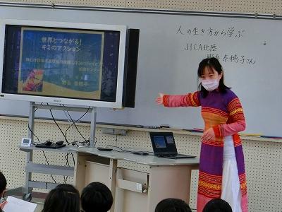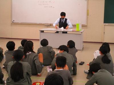 6年生は、総合の時間にJICA北陸の野吾さんをお招きして、貴重なお話を聞きました。大学を出てから、JICAで仕事をすることになった経緯や、実際にJICAでどのような仕事をしているのかを画像資料を使ってとても丁寧にお話しして下さいました。色々な国の人々の生活の様子、考えなどにも触れることができました。