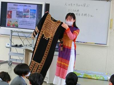 また、野吾さんは、実際に外国の生活で使われている衣料品等を持参してくださり、子ども達はそれらを通して、異国の雰囲気も味わっていました。ご厚意で実際に触ってみることも出来、貴重な体験ができました。