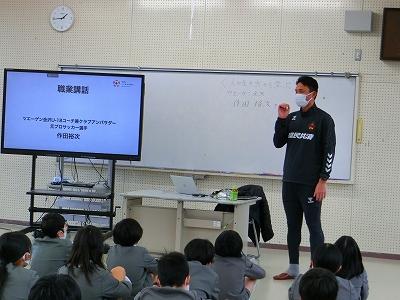 6年生は総合のキャリア教育「人の生き方に学ぶ」でツエーゲン金沢の元プロサッカー選手の作田裕次さんをお招きして講話をしていただきました。