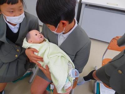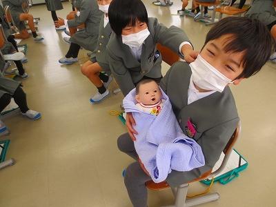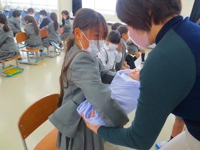だっこ体験では、赤ちゃんの生まれたときの身長・体重の人形をだっこさせてもらいました。本物の赤ちゃんのように可愛がったり恐る恐る触ったり、上手にだっこしていました。「思ったより重い!」など興味津々な様子でした。