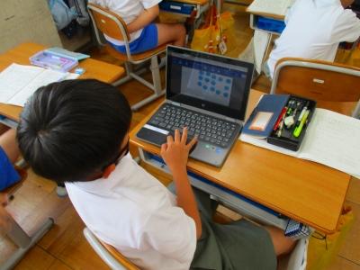 算数では、あまりのあるわり算に挑戦しています。一人一台端末を活用することで、具体的な場面を想像しながら計算の方法を考えています。初めは慣れない操作で難しいこともありましたが、自分の考えを上手く表現することができるようになってきました。