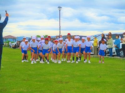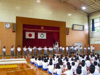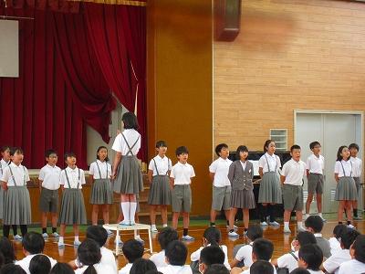 本校では、毎朝5,6年生の企画委員の人が、あいさつ運動を展開しています。ある時から、企画委員がいつものように「おはようございます」と挨拶をしていると、1年生が学校から出てきて、企画委員の横に並び、挨拶のお手伝いをしてくれるようになりました。