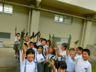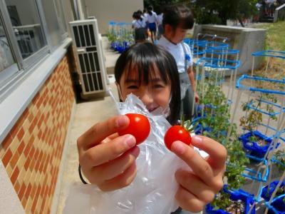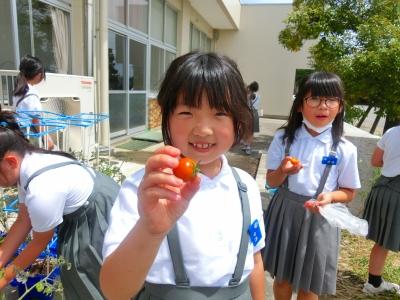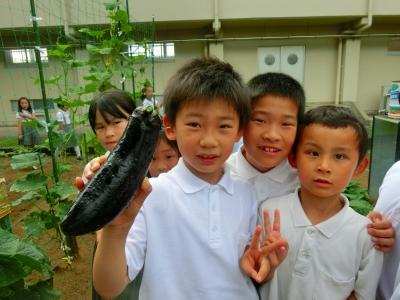 2年生は、自分でそだてているミニトマトや畑で育てている野菜を収穫しました。その場でミニトマトを食べたり、ナスやキュウリをおうちに持って帰ったりして喜んでいました。