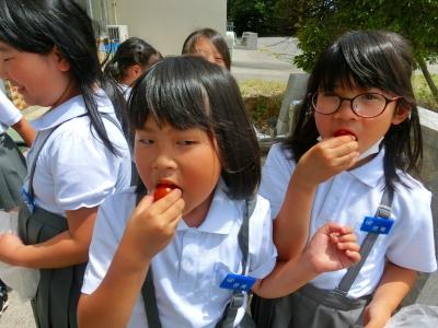 「真っ赤な方があまい!」や「オレンジっぽいのも食べてみようかな~」など、自分の育てたミニトマトを味わっている子もいました。