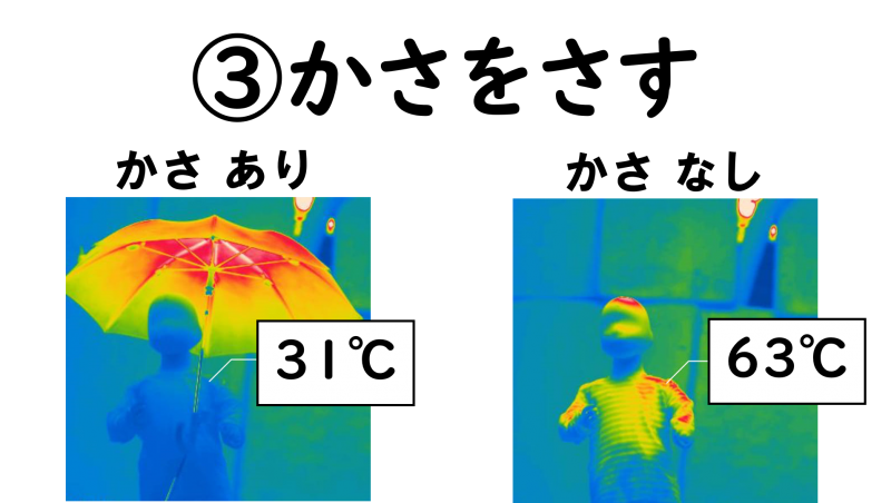 そして、登下校時では、①日差しが直接頭部に当たらないよう安全帽子を着用すること、②マスクは熱がこもりやすく、喉の渇きに気づきにくくなるため、はずして登下校すること、③日差しが直接体全体にあたることを避けるために雨傘登下校をおすすめすることの3つについてお話がありました。