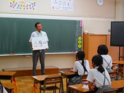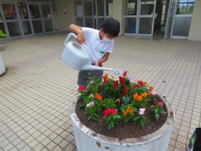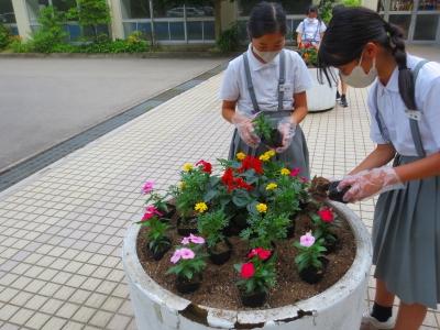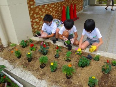 今日は人権の花の取り組みで、人権に関する話を聞き、玄関の花壇に花を植えました。