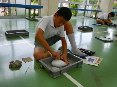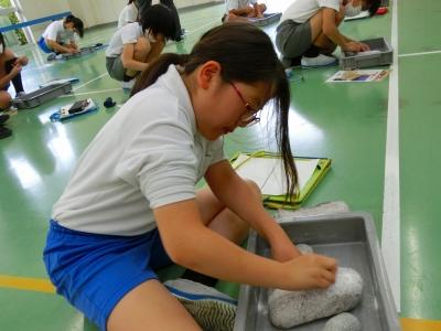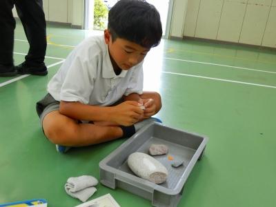 自分達で勾玉を作成する体験活動と、実物を見せてもらいながら縄文時代の人々の暮らしぶりについてお話を聞く活動が行われました。