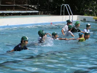 1学期の水泳授業は7月21日で終了しました。最後の授業は高学年による着衣泳でした。着衣泳とは、日常着を着たままプールに入り、歩いたり、泳いだりすることで、実際に海難事故に遭遇した際に身を守るためにどんな事に気をつけることが必要かを学ぶ授業です。