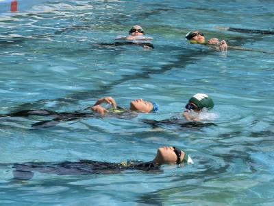 まずは、水の中で歩いてみたのですが、「重い」「進まない」というつぶやきがあちらこちらから聞こえてきました。水を含んだ着衣の重さを実感した後に、泳ぐ体験もしてみました。これも、子ども達にとっては初めての体験でした。意外とすいすい泳げる子もいましたが、「(思ったより)進まない」と苦労している子が多かったです。