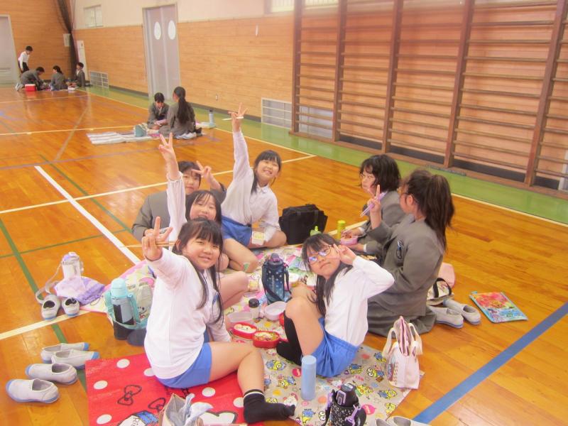 遠足はあいにくの雨。ということで今日は体育館に集まって敷物を敷いて体育館でお弁当を食べました。