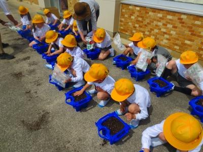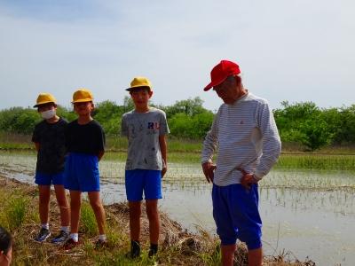 本日、川辺俊一様にご協力をいただき、田植え体験を行いました。子どもたちは初めての田んぼに苗を植えるという体験に、最初は難しさや素足で田んぼに入ることに抵抗感を感じていた子もいましたが、声を掛け合いながら活動に取り組み、最後は笑顔で体験を終えていました。体験を通して、田植えの大変さや難しさを実感しているようでした。