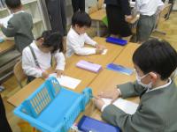 絵本を見たり、ショート動画を見たり、絵を見たり、おたすけカードを使ったり、自分で考えたりとそれぞれ自分で選んでたくさんの言葉を見つけ、文づくりをがんばっていました。そのあと、グループごとにできた文を読みながら、句読点がぬけていたり、文字が間違っていたりしたものを修正しました。最後には、がんばっていた友達を見つけて「すてきだったよ」と伝え合う姿がたくさんあり、見ている先生たちも思わず笑顔になっていました。