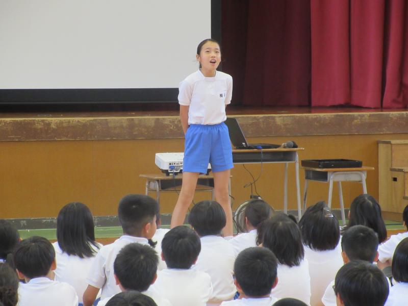 全校集会。はじめに全校で、元気いっぱいに校歌を歌いました。