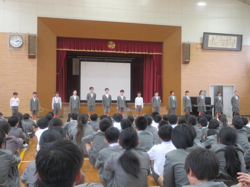 この後は全校で「もみじ」の合唱。4年生が下のパートを歌い、その他の学年はみんな上のパートを歌いました。体育館中に素敵なハーモニーが広がりました。