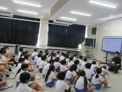 大根布小学校でも、本日、津幡警察署の方々にお越しいただき、6年生を対象に防災教室を実施しました。