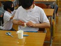 一番難しいのは、汁物です。給食の食缶は保温性が高いため、熱々の汁物が入っています。その汁物をお玉で上手にすくってこぼさずに盛り付けることができるようになりました。
