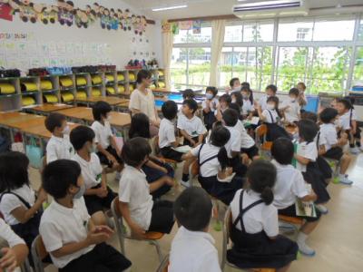 1年1組 河原さんに「なまえのないねこ」などの絵本を読んでいただきました。